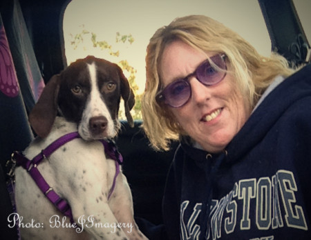 I headed out just after 5 am. Still dark out, you should have seen the moon; huge, full, and in a perfectly clear sky. It was setting as I made my way to pick up Danica, all along the hi-way ride, it lowered and began to glow that gorgeous and mysterious yellow, the color deepening as it set over the horizon. I marveled at The Wonderful Creator. I arrived to Karen’s early, as is my usual MO. I met Danica, and immediately fell in love! She was very nervous of a newcomer coming into her presence, and so frail. I still tear up thinking how Danica is finally headed towards the fur-ever home she so deserves, and that I am a part of helping get her there. Karen chided that it would be difficult to “pass Danica off” to the next volunteer because she was such a love, and I might want to take her home myself! Haha (she certainly called that one right!) I made extra sure I had the proper papers with Danica for her trip, and after some photos, scooped up that adorable Pointer, as she was shaking, gave her some hugs and gently got her settled on the front seat of my Jeep. I had water, water bowl, blanket, leash, collar, chew bone, and of course, some treats! I had already checked with the Foster Mom to see whether I needed a transport crate or not.